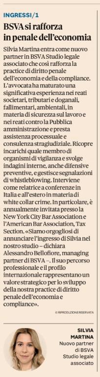 BSVA – Studio Legale Associato si rafforza nel penale dell’economia con l’ingresso di Silvia Martina, segnalato anche da Il Sole 24 Ore.