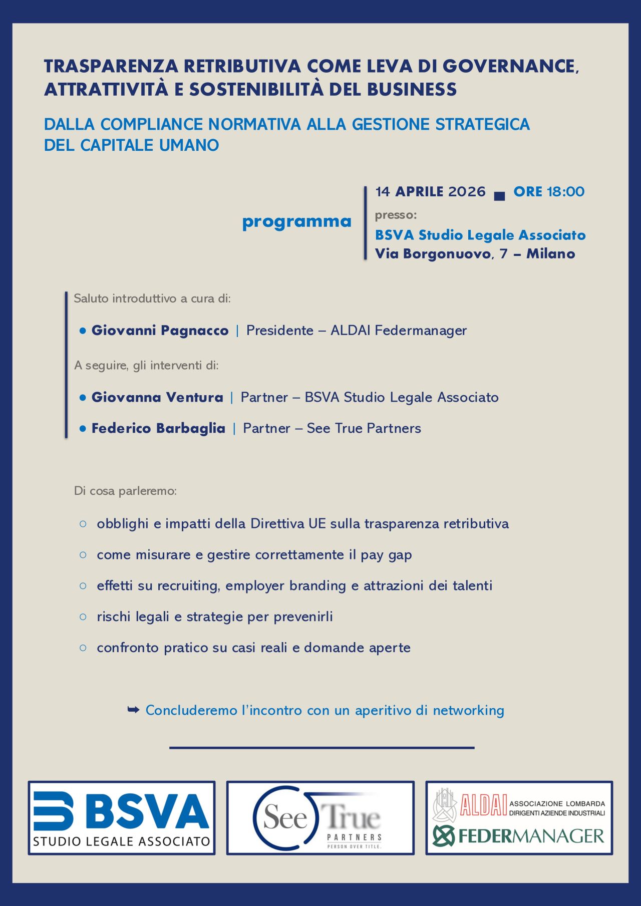 Dopo l’intervento introduttivo di Giovanni Pagnacco Presidente di ALDAI-Federmanager, approfondiremo con la nostra Giovanna Ventura, Partner BSVA specializzata in Diritto del Lavoro, e Federico Barbaglia Partner di See True Partners l’applicazione della normativa sulla trasparenza retributiva, che introduce misure per garantire la parità salariale e ridurre il gender pay gap all’interno delle organizzazioni.