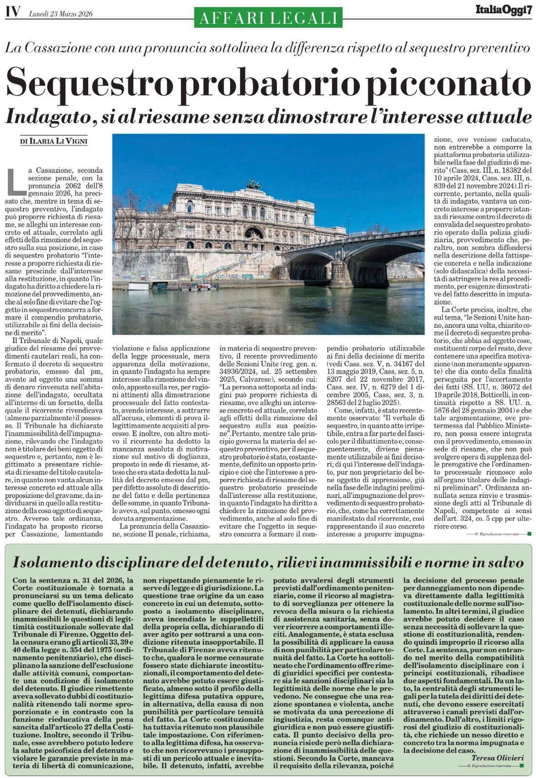 Ilaria Li-Vigni, Of Counsel di BSVA, specializzata di Diritto Penale, ha pubblicato su Italia Oggi 7, un interessante commento alla recente pronuncia della Corte di cassazione n. 2062, emessa, in data 8 gennaio 2026 in tema di sequestro probatorio.